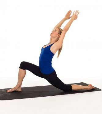 Bạn bước chân trái lên một bước lớn. Cong đầu gối phía trước và giơ hai tay lên cao. Đầu gối chân phải và mu bàn chân áp sát mặt sàn. Giữ nguyên tư thế trong một phút. Sau đó thả lỏng, về vị trí ban đầu và đổi bên.