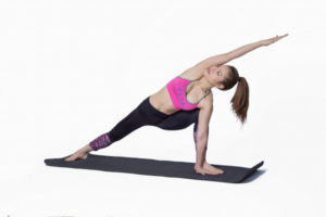 Bước 5: Thực hiện động tác vặn người sang bên phải và tay phải duỗi lên theo hướng thẳng đứng. Lưu ý, tay phải thẳng nhưng không gồng cùi chỏ. Đầu quay về bên phải nhìn theo hướng tay phải, rướn đỉnh đầu theo hướng trần nhà để xương sống được kéo giãn.