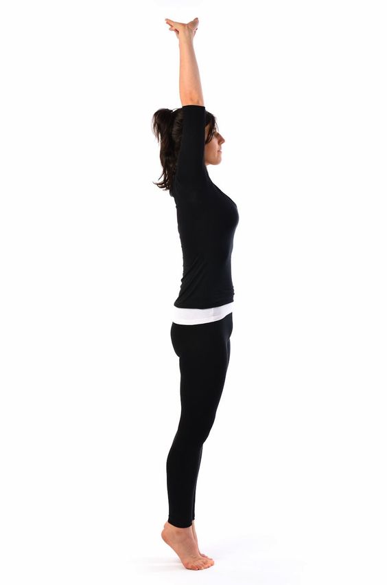 Động tác Yoga số 1: bạn hãy chuẩn bị bằng tư thế đứng thẳng người trên thảm tập, hai tay đưa lên trên cao qua đầu đồng thời đan các ngón tay lại với nhau và đẩy cho lòng bàn tay hướng lên phía trên trần. Hai chân để sát lại với nhau. Tiếp đến là bạn sẽ hít vào một hơi, bên cạnh đó là nhấc gót chân lên và đứng bằng những ngón chân. Với tư thế này bạn cứ giữ cho đến khi nào tới giới hạn cả bản thân mình là được. Cuối cùng là bạn thở ra, thả tay ra và hạ người trở về tư thế đứng ban đầu.